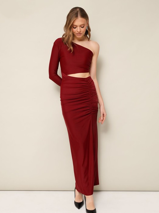 Вечернее платье прилегающего силуэта в длине макси, отрезное по линии талии, выполнено из эластичного полотна бифлекс. Ассиметричный вырез лифа с присборенным боковым швом по левой стороне. По линии талии обработан вырез, переходящий на спинку. Одно плечо открыто. Рукав длинный втачной. Юбка с драпировкой по рельефу, который переходит в высокий разрез по левой стороне.