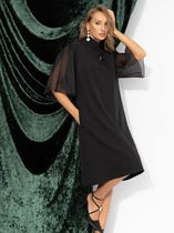 Платье выполнено из трикотажного полотна и органзы. Горловина с вырезом «каре». Перед и спинка с рельефами, которые декорированы воланами из органзы. Застёжка на потайную молнию в среднем шве спинки, переходящая в шлицу.