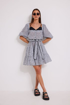 Легкое платье прямого силуэта. Округлая горловина на внутренней обтачке. Короткие цельнокроеные рукава, оканчиваются манжетами на отворотах. В среднем шве спинки расположен разрез с застежкой на пуговицу. Пояс из основного материала в комплекте. Низ ровный, без разрезов.