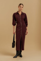 Легкое платье прямого силуэта. Округлая горловина на внутренней обтачке. Короткие цельнокроеные рукава, оканчиваются манжетами на отворотах. В среднем шве спинки расположен разрез с застежкой на пуговицу. Пояс из основного материала в комплекте. Низ ровный, без разрезов.