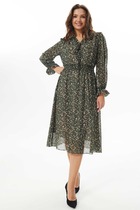 Платье полуприлегающего силуэта, выполненное на запах, длиной до середины бедра. Платье отрезное по линии талии. Лиф спинки со средним швом и рельефами. Лиф переда с рельефами от пройм до подреза по талии. Юбка спинки со средним швом и талиевыми вытачками. Юбка переда ассиметричная: правый перед укорочен, левый перед удлинен. Воротник пиджачного типа. Рукава двушовные, втачные, длинные. Застежка по переду на петли и пуговицы. Платье на подкладке с плечевыми накладками.