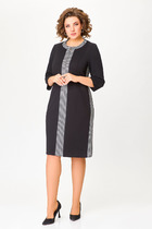 Платье полуприлегающего силуэта, выполненное на запах, длиной до середины бедра. Платье отрезное по линии талии. Лиф спинки со средним швом и рельефами. Лиф переда с рельефами от пройм до подреза по талии. Юбка спинки со средним швом и талиевыми вытачками. Юбка переда ассиметричная: правый перед укорочен, левый перед удлинен. Воротник пиджачного типа. Рукава двушовные, втачные, длинные. Застежка по переду на петли и пуговицы. Платье на подкладке с плечевыми накладками.