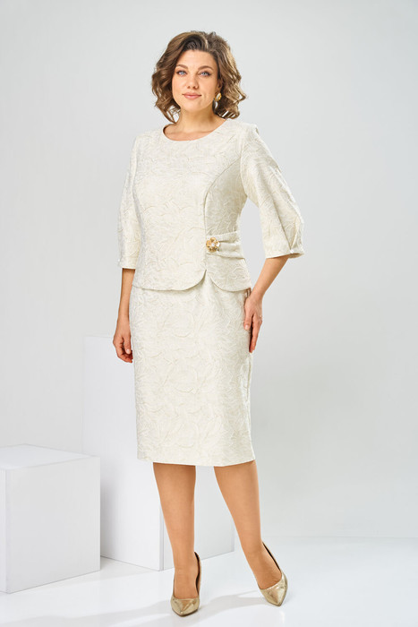 Платье женское, относится к нарядной торжественной одежде. Платье женское полу прилегающего силуэта, длиной за колено, выполнено в виде имитации костюма. Лиф платья отлетной. Перед с 2-мя отрезными бочками, левый бочок с отделочным фигурным поясом, декорированным объёмным украшением, шов притачивания левого бочка с разрезом с закруглёнными концами. Спинка лифа со средним швом и 2-мя отрезными бочками. Лиф платья на подкладке, к которой крепится нижняя часть платья (юбка). Переднее полотнище нижней части с 2-мя таллиевыми вытачками. Заднее полотнище с 2-мя таллиевыми вытачками и средним швом, заканчивающимся шлицей. Нижняя часть платья на подкладке. Горловина круглая, обтачная, без воротника. Застёжка на потайную тесьму-молнию в среднем шве спинки. Рукав втачной, одно шовный, длиной 3/4. Низ рукава со встречной складкой, обточной, складка декорирована пришивной пуговицей. Платье с плечевыми накладками. Длина спинки 104 см, длина рукава 42 см.