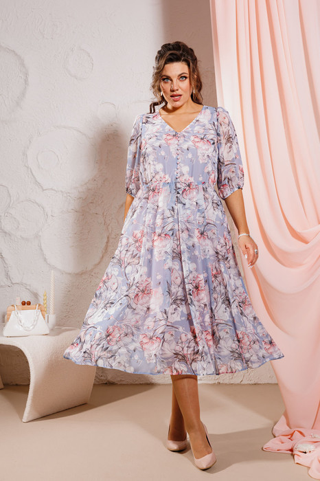 Платье предназначено для повседневной носки. Платье женское отрезное по линии талии, расширенное к низу, длиной до середины икры. Верхняя часть переда с 2-мя нагрудными вытачками, с притачной потайной вертикальной планкой. Верхняя часть спинки цельнокроеная. Горловина с V-образынм вырезом обтачная без воротника. Застёжка цельнокроеная бортовая на 11-ть навесных петель и 11-ть пришивных пуговиц. Нижняя часть переда с 2-мя односторонними складками и 1-ной встречной по центру. Нижняя часть спинки так же с 2-мя односторонними складками и 1-ной встречной по центру. Шов соединения верхней и нижней частей платья собраны на эластичную тесьму. Рукав втачной, одно шовный длиной за локоть. Окат рукава с лёгкой сборкой, низ рукава собран на эластичную тесьму. Платье на подкладке. Платье без плечевых накладок. К платью прилагается съёмный пояс. Длина спинки платья 116 см, длина рукава 37 см.