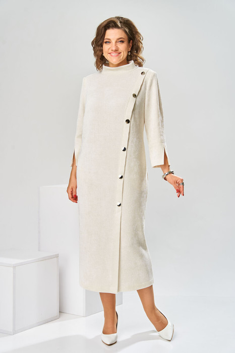 Платье женское предназначено для повседневной носки. Платье женское полу прилегающего силуэта, длиной до нижней части икры. Перед с 1-ной нагрудной вытачкой на центральной части, с 1-ним отрезным рельефом слева, выходящим из плечевого шва, шов соединения рельефа с передом декорирован 6-ю пришивными пуговицами и заканчивается шлицей. Спинка с 2-мя таллиевыми вытачками. В боковых швах обработаны карманы. Горловина круглая с втачной стойкой. Рукав втачной, 2-х шовный, длиной 7/8, верхний шов с разрезом. Платье с плечевыми накладками. Длина спинки платья 126 см, длина рукава 51 см.