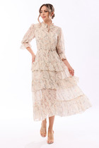 Платье женское, предназначено для повседневной носки. Платье женское отрезное по линии талии, слегка расширенное к низу, длиной до серединны икры. Верхняя часть переда с 2-мя нагрудными вытачками, с 2-мя вертикальными притачными планками, с 7-мью декоративными защипами шириной 0,3 см (с каждой стороны; нижняя часть переда с лёгкой сборкой по верхнему срезу по бокам). Верхняя часть спинки цельнокроеная; нижняя часть спинки с лёгкой сборкой по верхнему срезу. Платье с втачным поясом по линии талии с обработанной по ним кулисой с завязками с металлическими наконечниками. Горловина круглая с втачной стойкой. Застёжка центральная на верхней части переда на 5-ть вертикально обмётанных петель и 5-ть пришивных пуговиц. Рукав втачной, одно шовный длинный со сборкой и притачной манжетой, с застёжкой на обмётанную петлю и пришивную пуговицу. Платье на подкладке. Платье с плечевыми накладками. Длина спинки платья 126 см. Длина рукава 59 см.