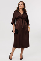 Платье женское относится к нарядной торжественной одежде. Платье женское прямого силуэта, длиной за колено. Перед с 2-мя нагрудными вытачками. Спинка с отрезной кокеткой с фигурным обтачным разрезом, фиксирующимся по горловине на 2-е обточные завязки. Горловина круглая, обтачная, без воротника. Рукав втачной, одношовный, длиной 3/4 с фигурным низом с 14-ю односторонними складками (по 7 с каждой стороны от угла манжеты), с притачной манжетой из отделочной ткани. Платье на подкладке. Платье без плечевых накладок.