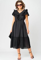 Платье женское относится к нарядной торжественной одежде. Платье женское прямого силуэта, длиной за колено. Перед с 2-мя нагрудными вытачками. Спинка с отрезной кокеткой с фигурным обтачным разрезом, фиксирующимся по горловине на 2-е обточные завязки. Горловина круглая, обтачная, без воротника. Рукав втачной, одношовный, длиной 3/4 с фигурным низом с 14-ю односторонними складками (по 7 с каждой стороны от угла манжеты), с притачной манжетой из отделочной ткани. Платье на подкладке. Платье без плечевых накладок.