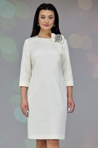 Платье женское относится к нарядной торжественной одежде. Платье женское прямого силуэта, длиной за колено. Перед с 2-мя нагрудными вытачками. Спинка с отрезной кокеткой с фигурным обтачным разрезом, фиксирующимся по горловине на 2-е обточные завязки. Горловина круглая, обтачная, без воротника. Рукав втачной, одношовный, длиной 3/4 с фигурным низом с 14-ю односторонними складками (по 7 с каждой стороны от угла манжеты), с притачной манжетой из отделочной ткани. Платье на подкладке. Платье без плечевых накладок.