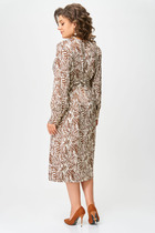 Платье из легкой плательной ткани. Платье отрезное по линии талии. По горловине переда и спинки - притачная планка. Легкая сборка от горловины по переду и по линии талии добавляет объема и воздушности. Юбка-клеш. Рукава - реглан, со сборкой по низу и широкими манжетами, застегивающимися на пуговицы и навесные петли. Застежка-молния-в боковом шве платья. Пояс в комплектацию не входит.