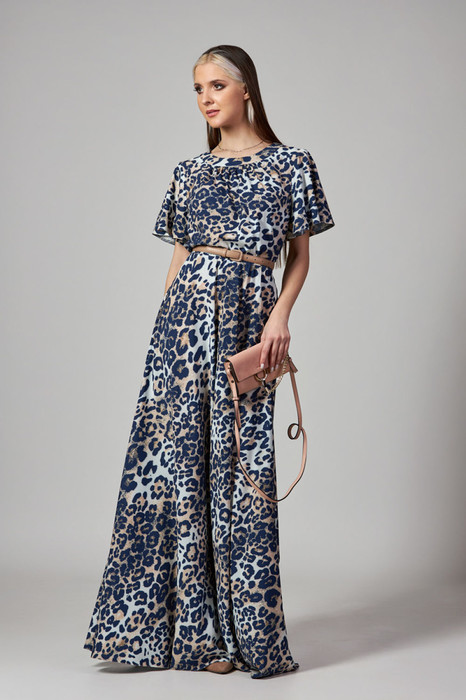 Платье из легкой плательной ткани. Платье отрезное по линии талии. По горловине переда и спинки - притачная планка. Легкая сборка от горловины по переду и по линии талии добавляет объема и воздушности. Рукава - легкие крылышки. Юбка-клеш, длинная. Застежка-молния - в боковом шве платья. Пояс в комплектацию не входит.