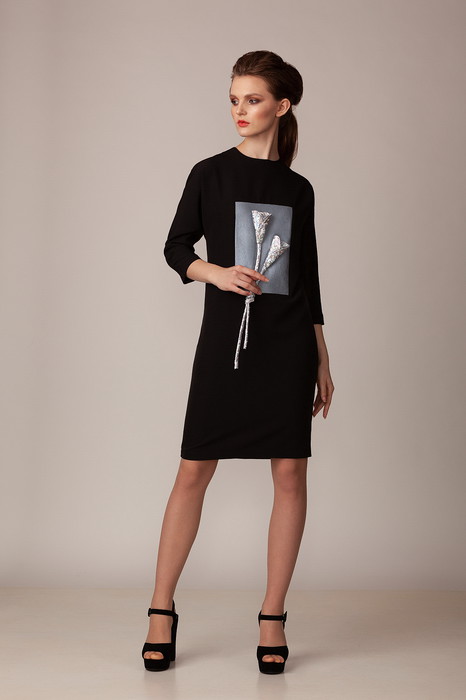 Платье силуэта «летучая мышь» из плательной стрейчевой ткани. Классический черный в сочетании со вставкой из кожи оттенка серебра и цветами ручной работы, украшающими перед платья - все это выглядит роскошно и стильно. Молния в среднем шве спинки. Рукава трехчетвертные. Длина изделия по спинке от точки основания шеи до низа-100 см. рукав - 58 см.