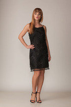 Платье прямого силуэта из легкой плательной ткани и атласа. Восхитительная объемная фактура ткани с вплетенным узором из люрексовой нити и нити «травка», ее воздушность и легкий атлас создают прекрасный современный коктейль. По переду - нагрудные вытачки. Низ платья декорирован отделочной тесьмой. Бретели декоративные. Застежка-молния в боковом шве. Длина изделия-94см.