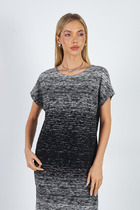 Платье женское из гладкокрашеного тканого полотна, свободное, слегка расширенное к низу, с глубоким V-образным вырезом горловины, обработанным внутренней обтачкой, без рукавов, с вытачками в области груди. Перед состоит из двух частей, в шве соединения деталей по центру длинный разрез.