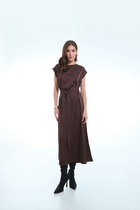 Съемные декоративные  манжеты придают романтичность и нарядность образу. Манжета  выполнена из атласной ткани  и декорирована "перьями". Платье А-силуэта. Рукав длинный расширенный  к низу.