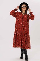 Платье женское А- силуэта длиной ниже колена, с двойными воланами по низу. Изделие на подкладке. По переду нагрудные вытачки. Горловина окантована. Рукав втачной, короткий. Верх рукава украшен окантованной капелькой на завязках, понизу двойные воланы.