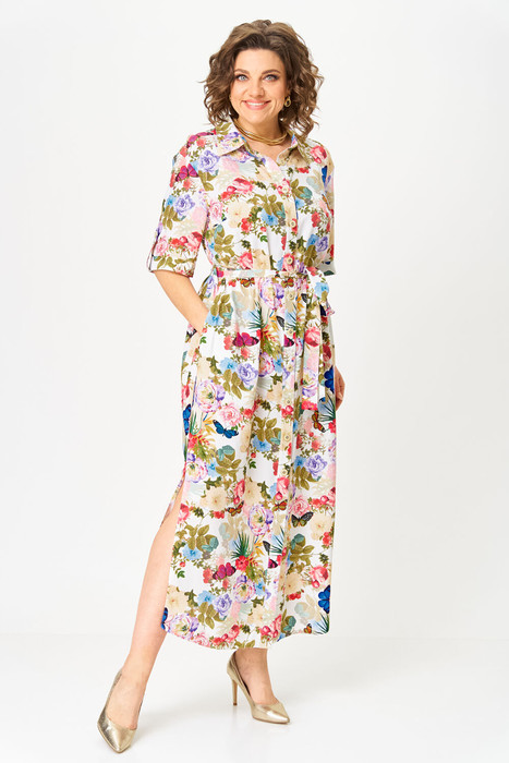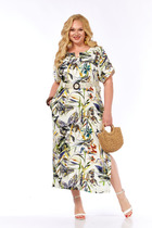 Платье рубашка прямого силуэта длиной макси. Линия плеча слегка спущена. Воротник отложной на стойке. По переду притачная планка с застежкой на 10 петель и пуговиц. По линии груди вытачки. В боковых швах карманы. По линии талии пояс в тон ткани. По верхней части спинки притачная кокетка, нижняя часть со встречной складкой. Рукав втачной, короткий понизу манжета с патой на пуговицу.