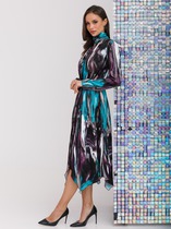 Платье выполнено из плательного струящегося сатина. Лиф отрезной по линии талии. Линия талии регулируется резинкой. Нижняя часть платья А-силуэта. Рукав длинный втачной. По низу рукава сборка и притачная манжета, застёгивающаяся на 2 петли и пуговицы. Горловина округлой формы, по центру переда капелька с завязкой. В комплекте ремень.