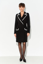 (плательный креп турецкого производства) прямого силуэта. По переду обработаны нагрудные выточки, спинка цельнокроеная. В боковых швах обработаны карманы, по низу боковых швов – разрезы.  Рукав втачной одношовный, со сборкой по шву притачивания манжеты. По низу рукава обработана широкая манжета 10,5 см, застёгивающаяся на 4 пробивные петли и  4 декоративные пуговицы.