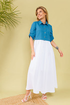 Платье из эластичного трикотажного полотна полуприлегающего силуэта. По переду обработаны нагрудные вытачки. Спинка цельнокроеная. Рукав втачной одношовный длиной 4/5 с манжетой из декоративного трикотажного довяза. В боковых швах обработаны карманы. Горловина V-оборазной формы, обработана декоративным трикотажным довязом.