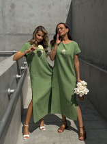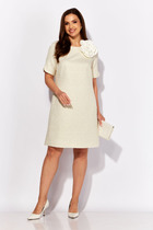 Платье из мягкой вискозной ткани, X-образного силуэта, отрезное по линии талии. Перед лифа с талиевыми вытачками, спинка лифа с центральным швом и талиевыми вытачками. Юбка расклешённая с карманами в боковых швах. Горловина округлой формы. Рукав втачной, короткий, формы «колокол».
