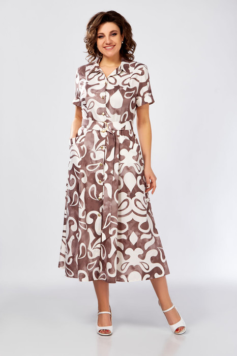 Платье из мягкой вискозной ткани, отрезное по линии талии с полуприлегающим лифом и юбкой А-силуэта, с центральной застёжкой на петли и декоративные пуговицы. Полочка с вертикальными рельефами, спинка с кокеткой и отрезными бочками. Юбка состоит из семи клиньев. По переду между швами обработан карман с планкой на косую. Воротник отложной рубашечного типа, с отрезной стойкой. Рукав втачной короткий, по низу с отложной манжетой.