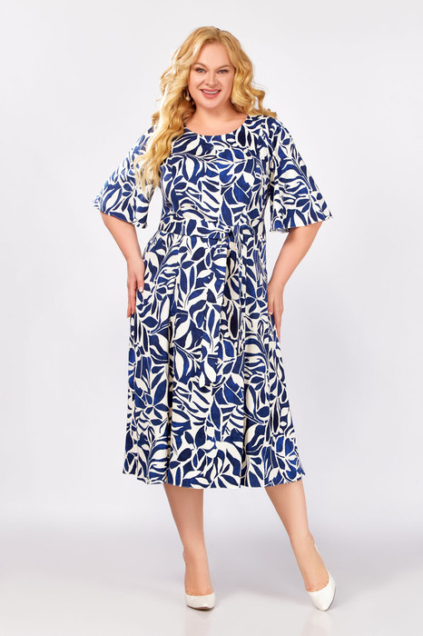 Платье полуприлегающего силуэта из мягкой вискозной ткани. Полочка с отрезными рельефами, спинка с центральным швом и рельефами. Горловина округлой формы. Рукав втачной, формы «колокол», по окату с лёгкой сборкой, длиной 34 см.