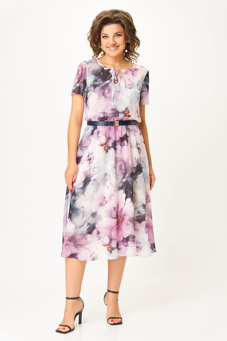 Платье из мягкой шифоновой ткани, на трикотажной подкладке, отрезное по линии талии, шов собран на эластичную тесьму-резинку. Горловина округлой формы, по переду капелька с завязкой. Рукав втачной, короткий.