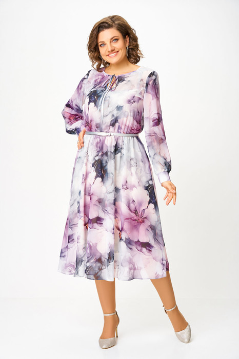 Платье из воздушной шифоновой ткани, на трикотажной подкладке, отрезное по линии талии, шов собран на эластичную тесьму-резинку. Горловина округлой формы, по переду капелька с завязкой. Рукав втачной одношовный, внизу со сборкой и манжетой, которая застёгивается на 2 петли и пуговицы.