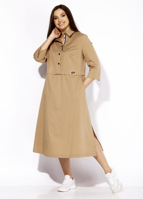 Платье женское, расширенное к низу, отрезное по талии. Рукав втачной, длиной 3/4 , по низу с разрезом на локтевом шве. По переду нагрудные вытачки. Воротник рубашечный на отрезной стойке. Застежка лифа платья центральная, на кнопки. Внутренняя планка акцентирована отделочной тесьмой. Спинка со средним швом. По низу лифа отлетная складка. Нижняя часть платья (юбка) расширенная, с карманами и разрезами по бокам.