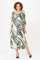 Платье женское, прямого силуэта, с цельнокройным рукавом, длинной 7/8.По переду ассиметричный, фигурный подрез , оформлен воланом и отделочной тесьмой. По спинке средний шов. Вырез горловины круглой формы с тонкой, подрезной бейкой.