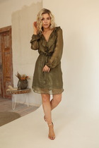 Платье женское ,расширенное к низу, с коротким втачным рукавом. Рукав выполнен из отделочной ткани с тремя складками по низу. Вырез горловины круглой формы с отделочной бейкой спереди. По спинке средний шов и застёжка в шве на потайную тесьму ,,молния". Декором служит съёмный цветок.