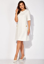 Платье женское, А-силуэта с коротким втачным рукавом, из трикотажного полотна. Вырез горловины круглой формы с подрезной бейкой. Спереди наклонные карманы с декоративными пуговицами. А-силуэт платью придают рельефы переда и спинки с цельнокройными бочками. По спинке средний шов и застежка на потайную тесьму "молния" Платье на трикотажной подкладке.