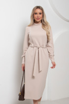 Платье женское полуприлегающего силуэта, выполненное из поливискозы плательной группы. Платье с двухбортной застежкой на петли-пуговицы. Горловина оформлена воротником пиджачного типа. Рукава двушовные, длиной 3/4, по низу обработаны притачной манжетой. По спинке - средний шов и талиевые выточки. По переду расположены нагрудные выточки. В левой боковой части переда вставлена отделочная деталь со складками, направленными к центру, над которой горизонтально расположена пата. В комплект к платью входит пояс из основной ткани с декоративной пряжкой, в цвет фурнитуры.
