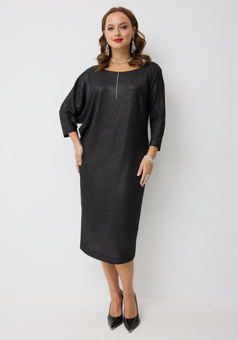 Платье полуприлегающего силуэта комбинированного покроя, выполненное из трикотажного полотна с люрексом. Горловина по переду оформлена в форме"лодочка", по спинке - аккуратный V- образный вырез. Один из рукавов втачной, другой формы" летучая мышь", длиной 3/4.