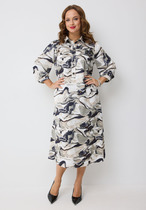 Платье А-силуэта, на подкладке, длиной мидакси, выполненное из плательной вискозы с принтом "волны". Платье на трикотажной подкладке. Горловина платья оформлена воротником рубашечного типа. Перед платья с центральной застёжкой на петли и пуговицы, расположенной до линии талии. По переду обработаны нагрудные вытачки. В верхней части переда косые встречные кокетки с декоративными воланами. В боковых швах обработаны карманы. Рукав втачной одношовный, длиной 3/4, низ рукава на притачной манжете, которая застёгивается на петлю и пуговицу. По верхней части спинки кокетка с воланом, нижняя часть - цельнокроеная.