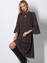 Платье прилегающего силуэта, длиной миди, выполненное из плательной поливискозы. Платье жакетного типа с ассиметричным передом. Одна из сторон переда имитирует жакет и юбку, другая-платье. Перед с талиевыми вытачками с подрезом. В области груди настрочена декоративная листочка, в области бедер - карманы-обманки с листочками и клапаном. По переду обработан разрез. В области талии расположена застёжка на 2 петли и крупные декоративные пуговицы. Спинка со средним швом, в который вставлена потайная молния. Рукав 2-х шовный втачной, длиной 3/4.