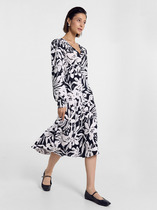 Платье прилегающего силуэта, длиной миди, выполненное из плательной поливискозы. Платье жакетного типа с ассиметричным передом. Одна из сторон переда имитирует жакет и юбку, другая-платье. Перед с талиевыми вытачками с подрезом. В области груди настрочена декоративная листочка, в области бедер - карманы-обманки с листочками и клапаном. По переду обработан разрез. В области талии расположена застёжка на 2 петли и крупные декоративные пуговицы. Спинка со средним швом, в который вставлена потайная молния. Рукав 2-х шовный втачной, длиной 3/4.
