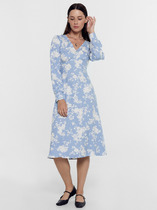 Платье приталенное, отрезное по линии талии. По лифу рельефы. Юбка спереди со встречными складками, карманами с декоративным клапаном. По горловине кокетка. Короткий рукав – реглан со складкой. Мягкий декоративный пояс фиксируется шлёвками. Сквозная застёжка с планками. Длина изделия 115 см.