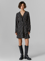 Платье свободного кроя отрезное выше линии талии (по переду и спинке) с декоративными планками. По линии подреза сборка. Спереди карманы, по лифу рельефы. Сквозная застёжка с планками на петлю и пуговицу. Рукав Вѕ с отворотом. Длина изделия 107 см.