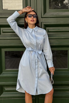 Элегантное голубое платье-рубашка с поясом и вышивкой на нагрудном кармане — идеальный выбор для повседневного и офисного образа. Модель выполнена из качественной костюмной ткани, приятной к телу, сдержанно сияющей на солнце. Благодаря прямому силуэту и акценту на талии за счёт пояса, платье выгодно подчеркивает фигуру и подходит для любого типа телосложения.