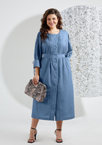 Платье приталенного силуэта. Верхняя часть платья из трикотажного полотна, нижняя из легкой ткани Ниагара. Округлая горловина на внешней обтачке. Длинные втачные рукава. Отрезная линия талии. Низ выполнен в виде юбки колокола, без разрезов. Пояс из основного материала в комплекте.
