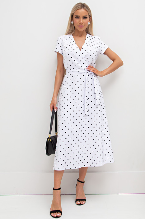 Комфортное платье приталенного силуэта. V - образная горловина на внутренней обтачке переходящая в запах. Короткий втачной рукав. Модель отрезная по линии талии, сбоку застежка на потайную молнию. Низ ровный, без разрезов. Пояс из основного материала в комплекте.