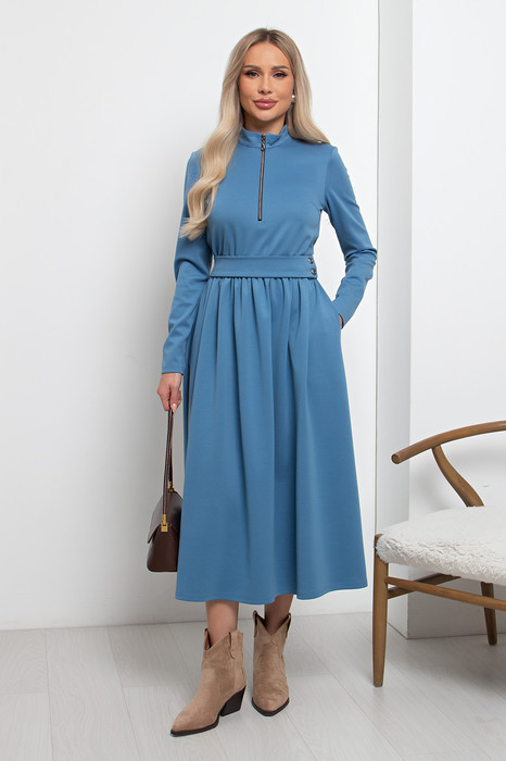 Элегантное платье приталенного силуэта из трикотажного полотна. Горловина оформлена воротником- стойкой с застежкой на молнию. Длинный втачной рукав. Модель отрезная по линии талии, присборена на эластичную резинку. В боковых швах функциональные карманы. Пояс с застежкой на петли и пуговицы. Низ ровный, без разрезов.