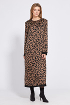 Праздничное платье прилегающего силуэта из плотного трикотажного полотна. Округлая горловина на внутренней обтачке. По спинке застежка на потайную молнию. Перед юбки оформлен баской, переходящей по диагонали в волан, через плечо на спинку. Низ ровный, сзади разрез.