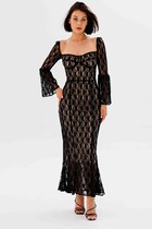 Платье-туника из ажурного трикотажного полотна с капюшоном. Длина миди. Вырез горловины V-образной формы. Рукав узкий, длинный. По низу рукава отверстие для большого пальца. В боковых швах высокие разрезы от талии. Талия фиксируется длинными завязывающимися поясками. Длина 119 см. Длина рукава 67 см.