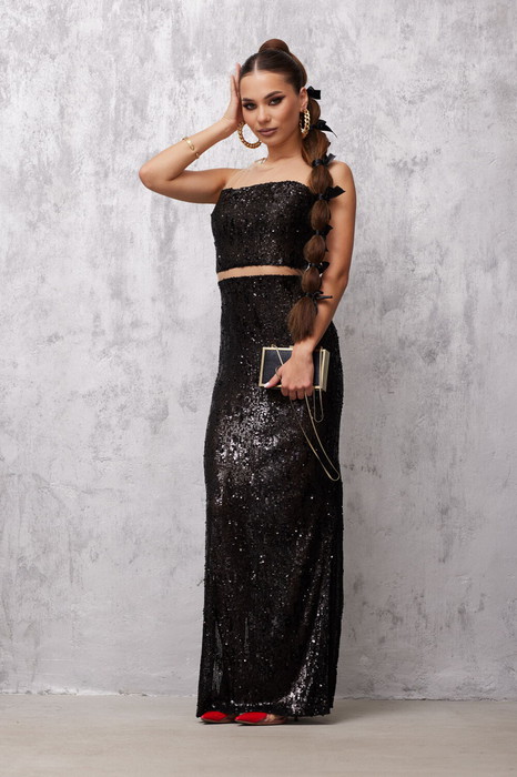 Платье прилегающего силуэта из ткани «пайетки». Длина макси. Верхняя часть платья из прозрачной сетки. Застежка по спинке на потайную молнию. Платье без рукавов. В боковых швах высокие разрезы. Платье на подкладке. Длина 152 см.