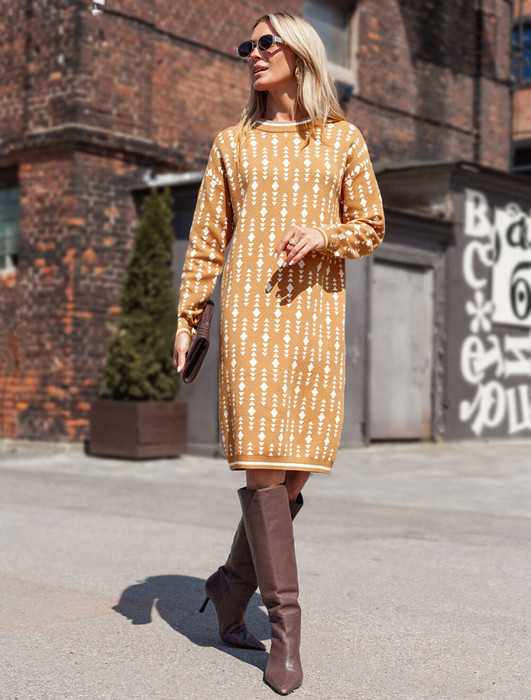 Платье жаккардовой вязки выполнено из мягкой пряжи на основе вискозы с добавлением кашемира. Модель свободного силуэта подходит для любой фигуры. Нежная пряжа очень комфортно ощущается на теле, сохраняя оптимальное тепло при этом не перегревая. Совет стилиста: жаккардовое платье отличная инвестиция в базовый гардероб, которая поможет создать дорогие образы. Носите с высокими сапогами удлиняя силуэт или плотными колготками.