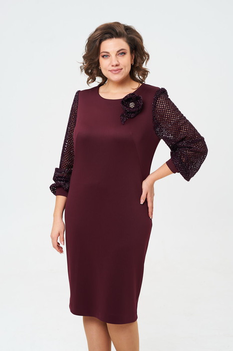 Платье женское из трикотажной ткани полуприлегающего силуэта, слегка зауженное к низу. Перед с нагрудными вытачками, выходящими из бокового шва. Спинка со средним швом, в котором обработана застёжка на тесьму-молнию и разрез - шлица. Рукава втачные одношовные из отделочной ткани с манжетом. Низ рукава со сборкой. Длина платья по спинке - 101 см. Длина рукава - 61 см.