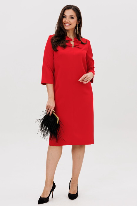 Платье женское полуприлегающего силуэта, зауженное к низу. С талиевыми вытачками, выходящими из бокового шва. Со средним швом, оформленным фигурными выемками с двумя объемными бантами с протяжками в области горловины. Спинка со средним швом, который заканчивается разрезом, и в котором обработана потайная тесьма-молния. Рукав втачной одношовный прямой. Горловина по переду с цельнокроенной стойкой, на спинке с отрезной.